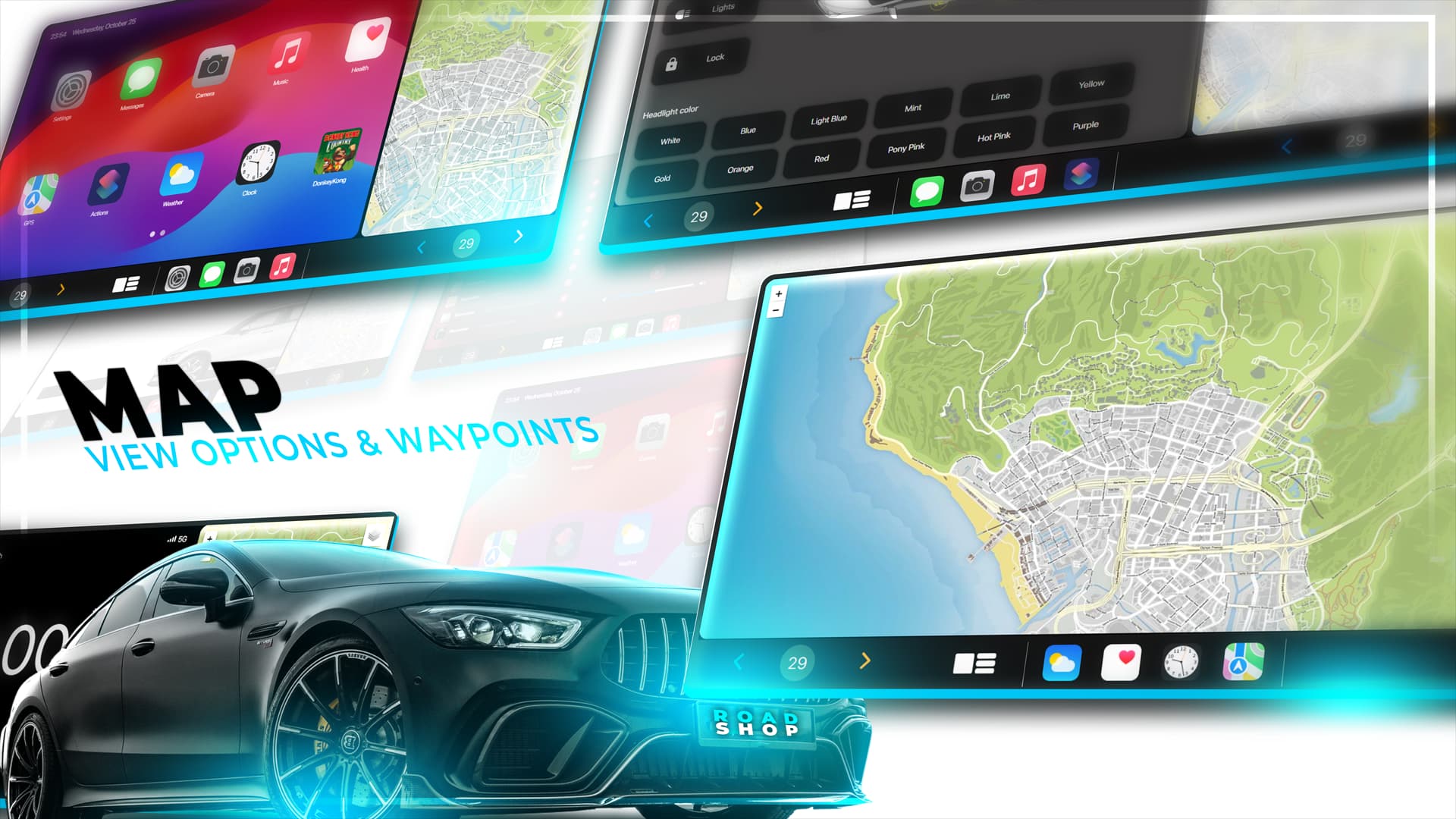 Apps: Health App ( shows body & engine damage, fuel, engine, temperature and dirt ) , Settings, Actions App ( control your car, change your seat, open doors, lock your car and more! ), Music App (Other players listen to the music, pause button and song information are included, Music adapts to your Car ) , GPS App ( shows current locations, set waypoints ), Camera App ( Rear view camera and front camera ), Weather App, Clock, Games, Messages App