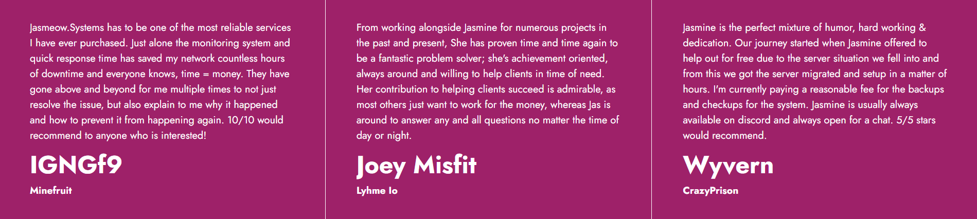 - Multiple hosting companies, incorporated businesses and large Minecraft networks have approached Jasmeow.Systems for their projects to be supported and require immediate assistance which is why we provide dedicated support.