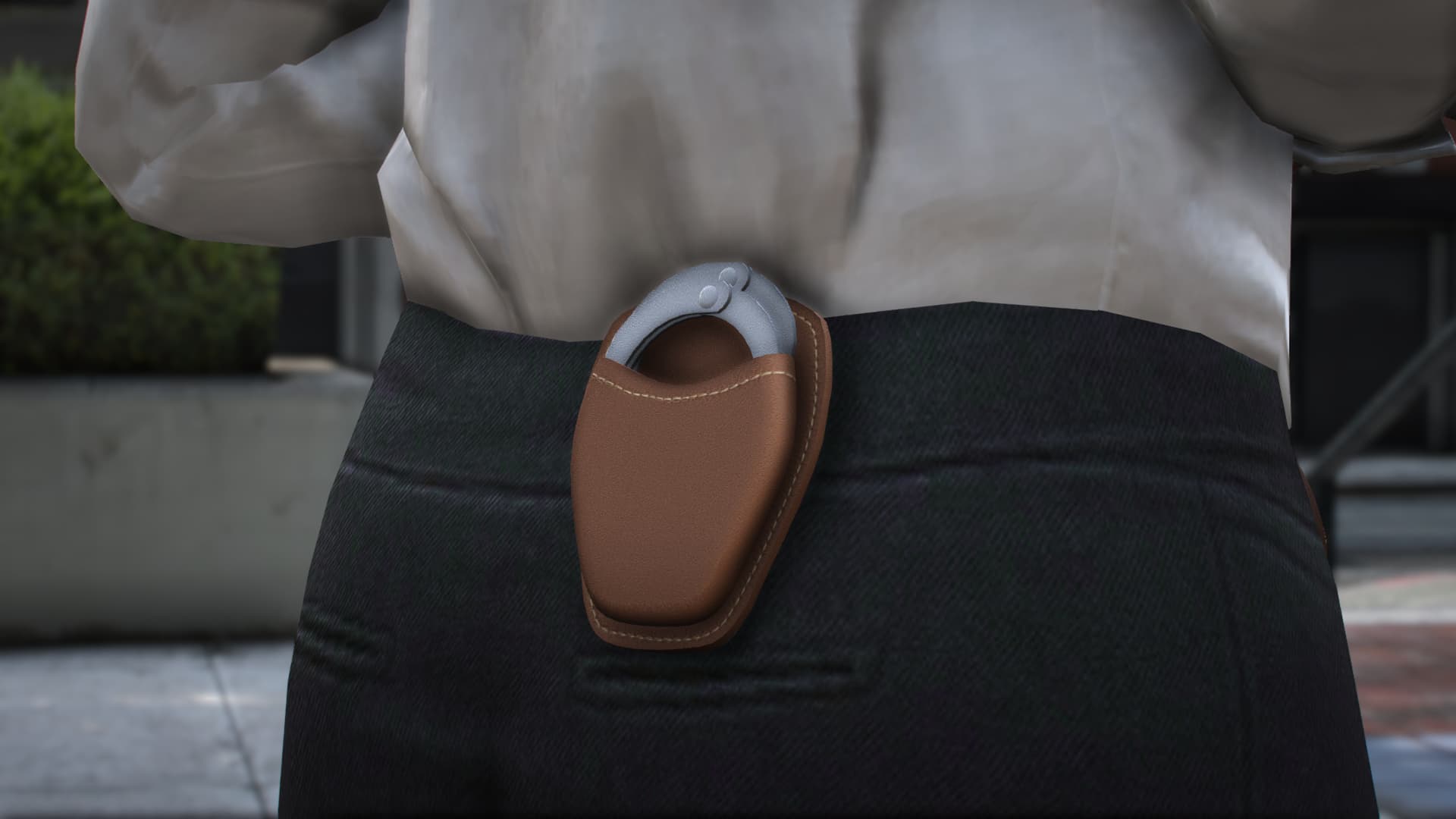 - Badge in a holster without the custom cuffs holder, worn on the right side of the pants;