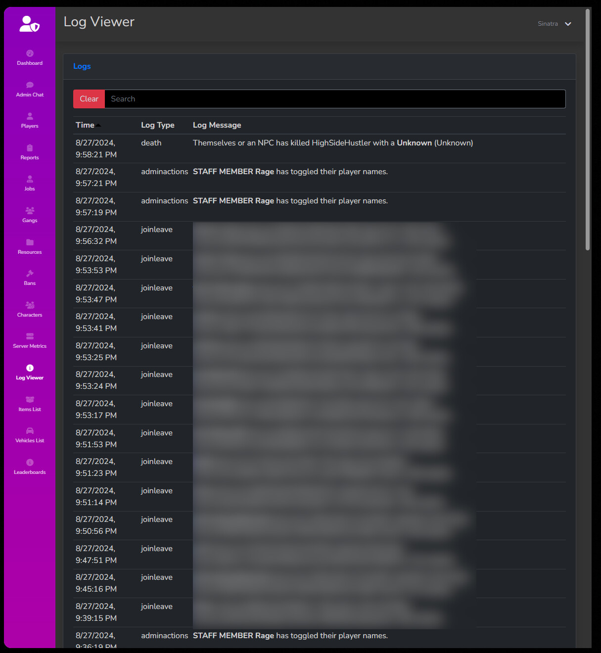 Log Viewer page where you can view real time server logs intercepted from the qb-logs ‘createLog’ event. This means all major log events will be automatically displayed and searchable in 919 ADMIN, with zero setup. It will intercept logs from many different resources.