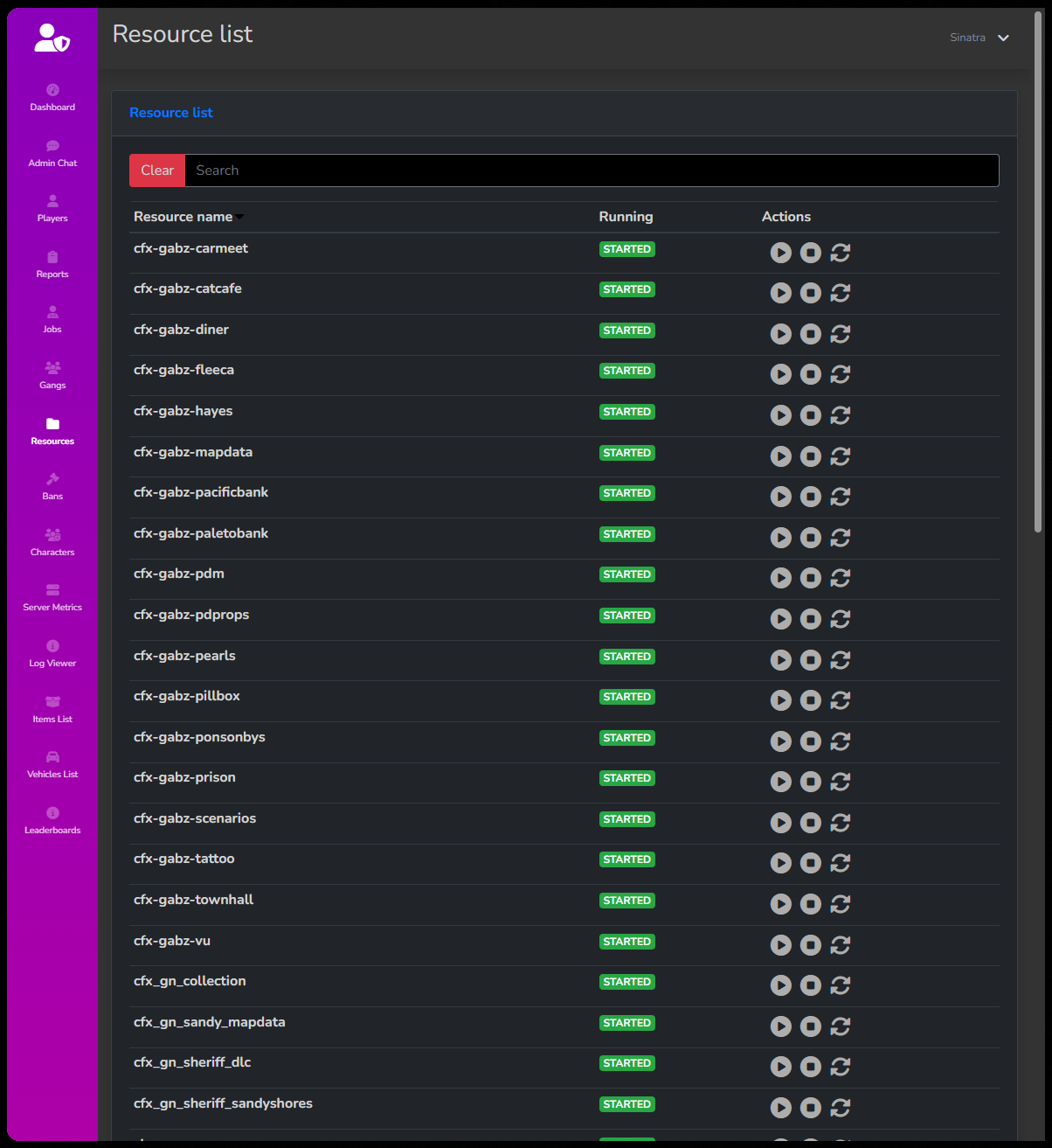 Resources page that lists all resources currently loaded by FXServer as well as their status and provides the ability to start, stop, and restart any resource.