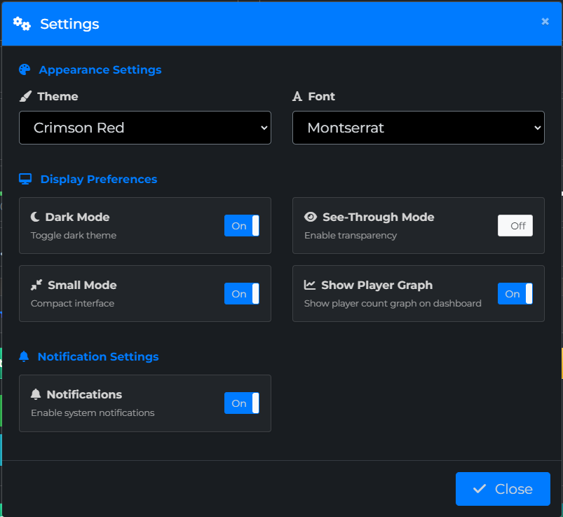 Dark Mode that can be enabled and disabled in the Settings window, and saves to your character.