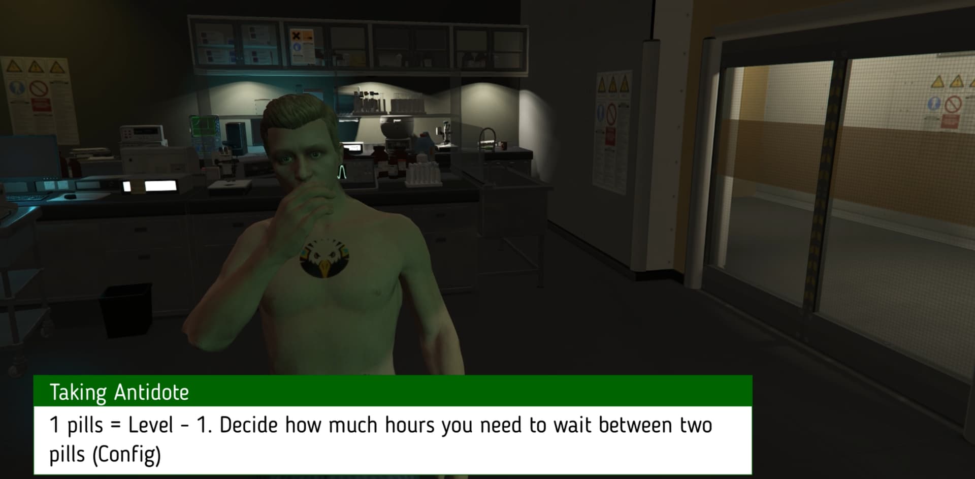 A Specific job can produce antidote, for healing players. Antidote decrease the level of Sickness by 1, and you can configure a needed delay between 2 takes.