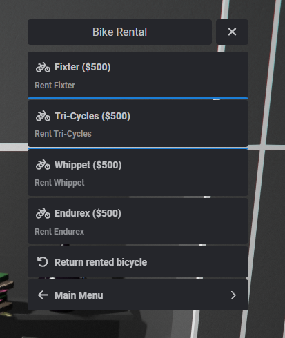 Players can rent bicycles for a configurable fee & duration.