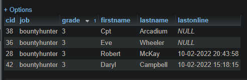 (SELECT charidentifier AS cid, job AS job, jobgrade AS grade, firstname AS firstname, lastname AS lastname, NULL AS lastonline FROM characters WHERE job = "bountyhunter" AND NOT EXISTS( SELECT * FROM marshal_multi_jobs WHERE job = 'bountyhunter' AND charidentifier = cid)) UNION (SELECT cid AS cid, job AS job, jobgrade AS grade, firstname AS firstname, lastname AS lastname, lastonline AS lastonline FROM marshal_multi_jobs WHERE job = 'bountyhunter') ORDER BY grade DESC;