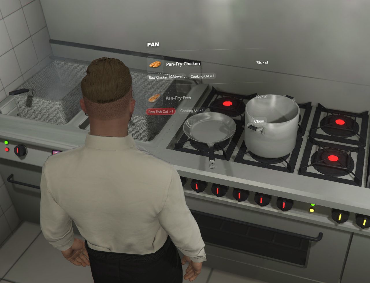 - Use the frying pan to cook fish and chicken through a dedicated stovetop flow.