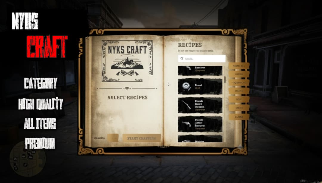 Elevate your server’s immersion with NyksCraft, a comprehensive crafting system built around a unique, in-game crafting book. This resource allows players to use a “Crafting Book” item to open a beautiful, RDR2-themed UI, where they can browse, filter, and craft items, weapons, and more.