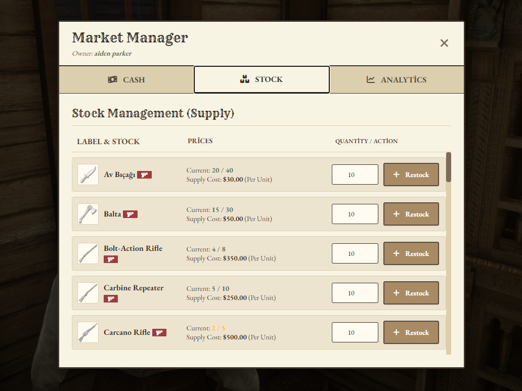 - Stock: See the current and maximum stock levels for all items. Restock items using the owner’s personal money at a predefined supply cost (