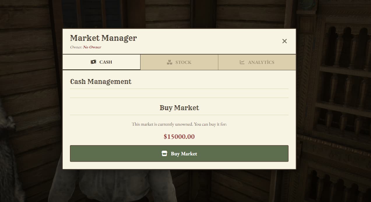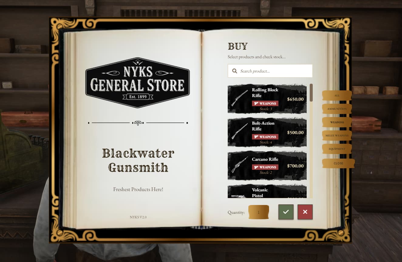 Allow your players to purchase, manage, restock, and control the cash register of markets across the map. With its unique RDR2 “book” themed UI and detailed features, NyksStore adds an unparalleled roleplay experience to your server.
