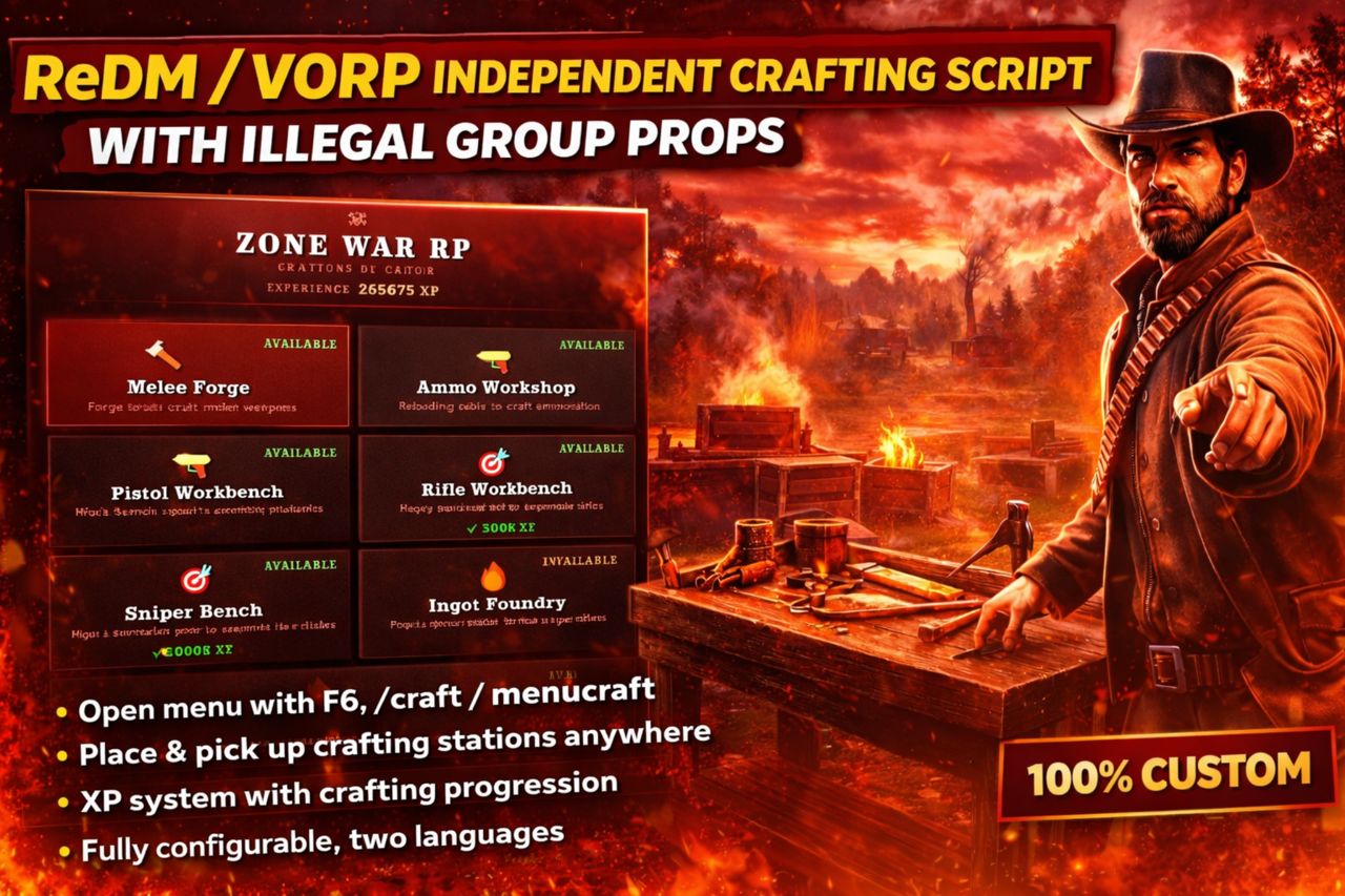 ZRP-Crafting est un système de crafting indépendant pour RedM/VORP permettant aux joueurs de placer librement leurs ateliers de fabrication où ils v■■■■■t.