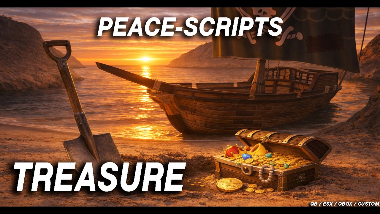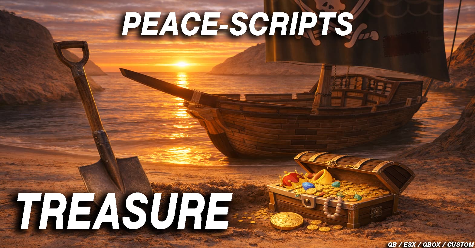 PEACE-TREASURE is a treasure hunt system for FiveM, compatible with QBCore, ESX, QBox and custom frameworks. It offers over 900 configured locations, multiple treasure types, card-based progression, tools (detector, shovel, saw), interactive pirate NPCs, boat integration (props), and full configuration via the config.lua file.