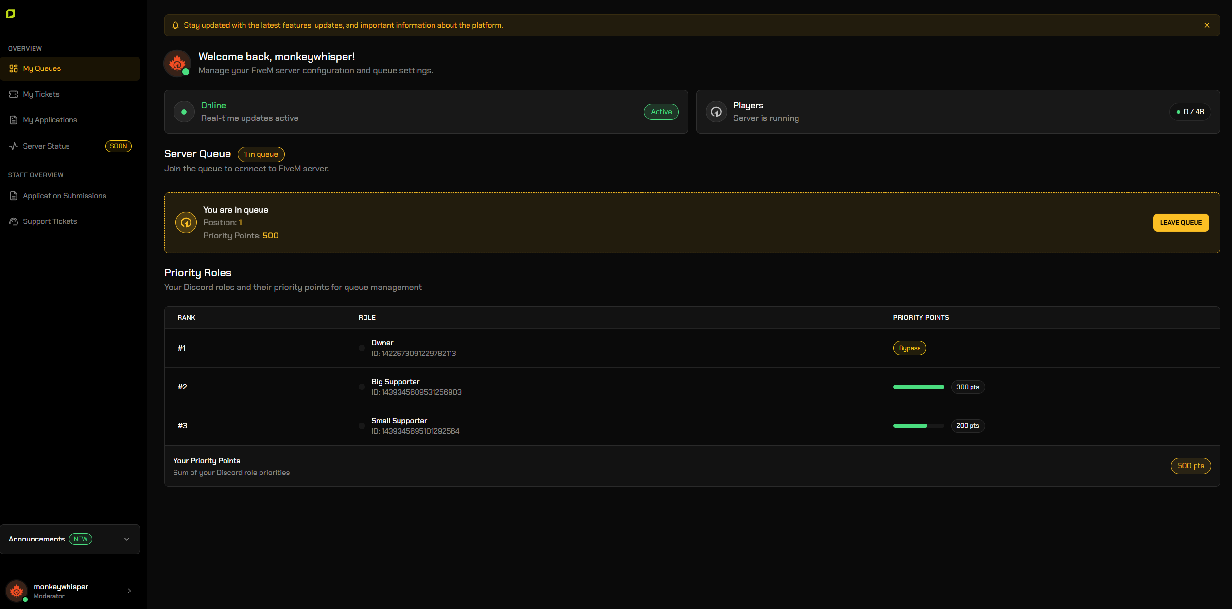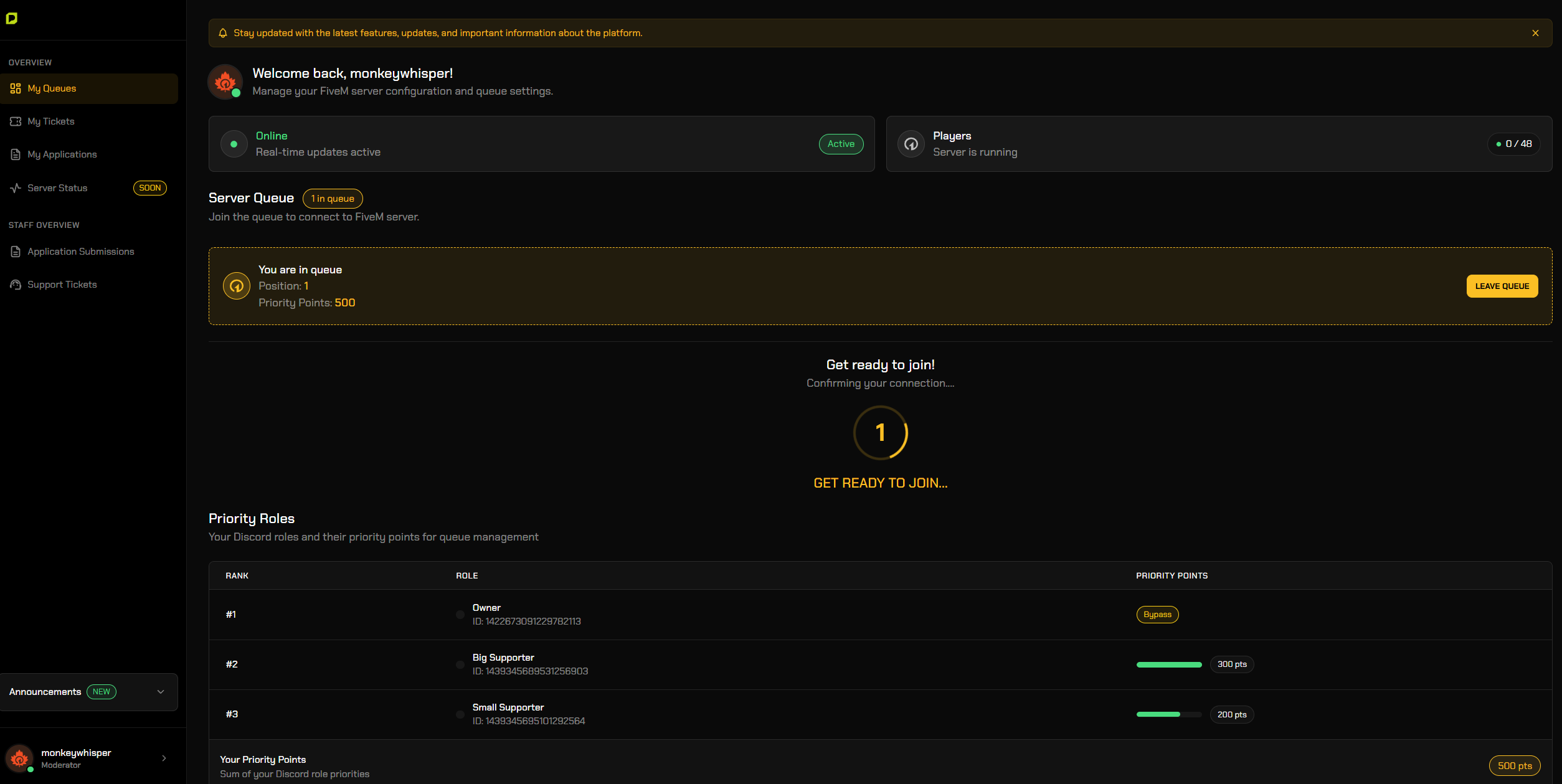 Give players a clean website to join the queue, see their position, check their priority, and auto-connect when it is their turn. Everything updates in real time and works with your own branding.