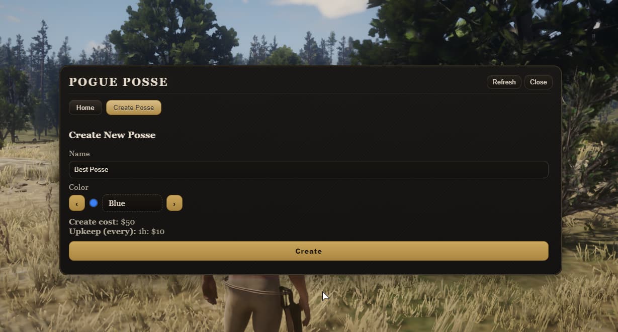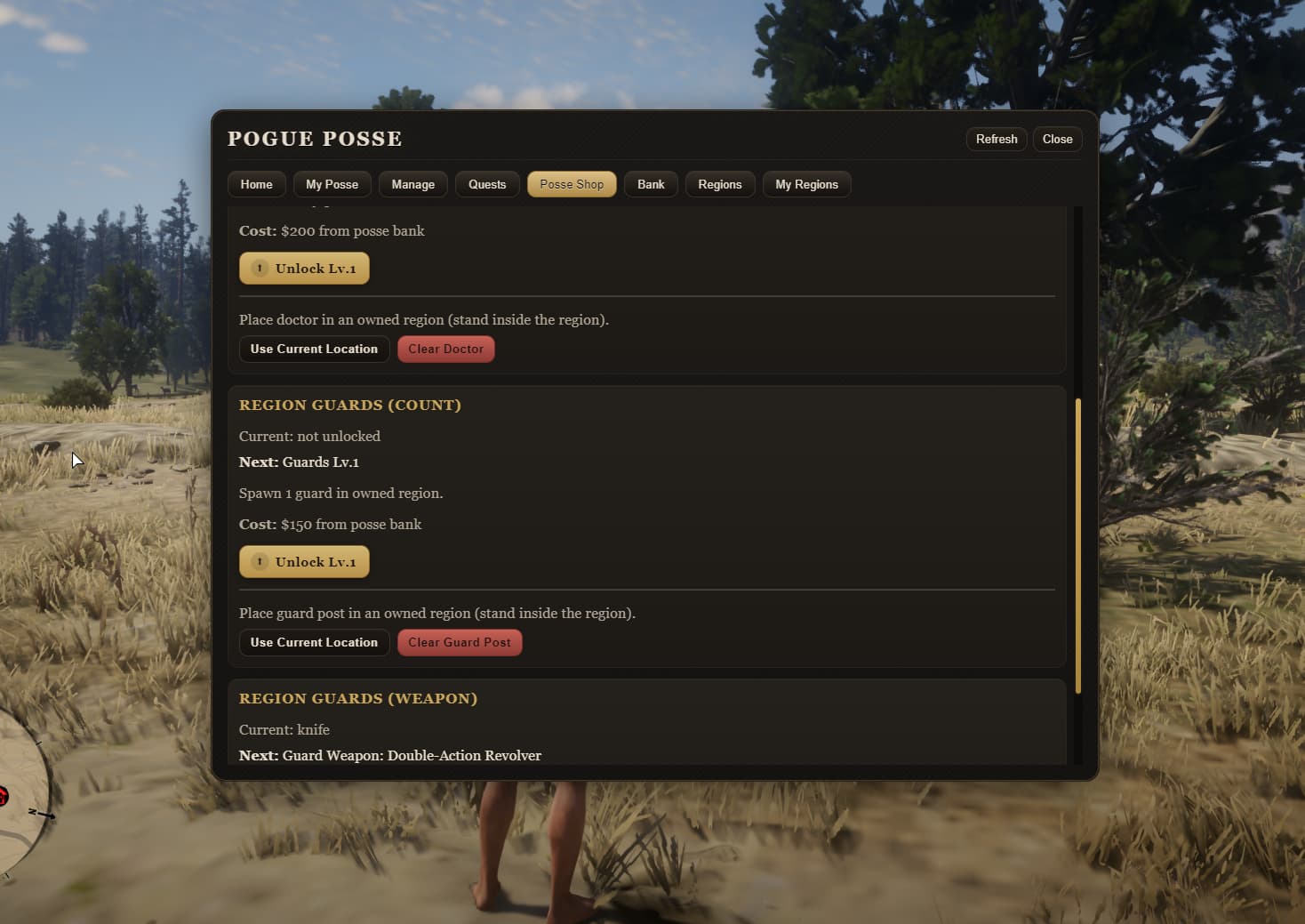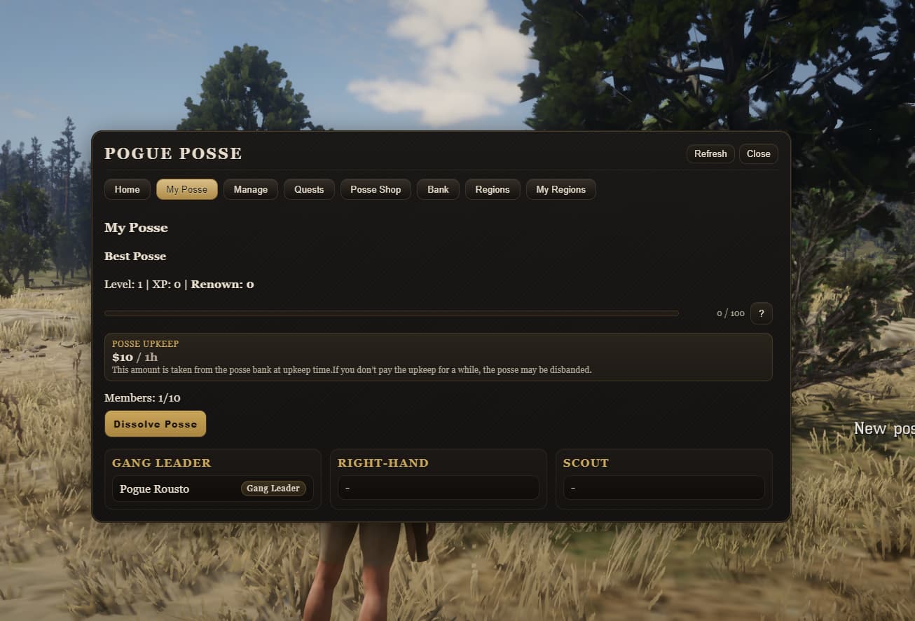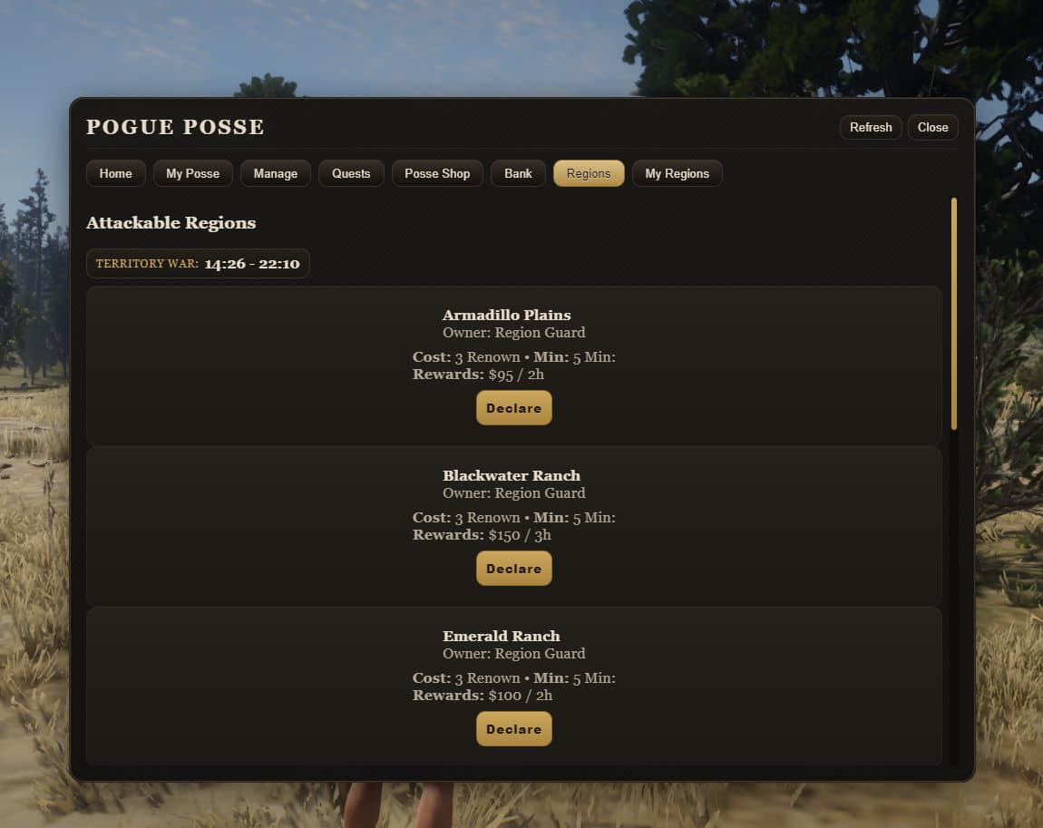 Pogue Posse & Territory War is a full posse management + territory control system for RedM. Players create posses, pick name/color, pay upkeep, run quests to gain renown and XP, buy doctors and bodyguards — and then use all of that to fight for regions on the map.