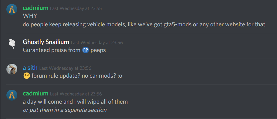 To be quite truthful like Ice said most vehicles violate the actual terms of you downloading them they specifically state don’t reupload but looks like it’s done anyway because ppl don’t care about rights. Second half the vehicles that are converted to add-ons and then released break clients causing the discord to go haywire with “my game is crashing when I joojn this server and I don’t know why”. They should be banned and not allowed here follow the guidelines or get a developer to assist making assests for you.