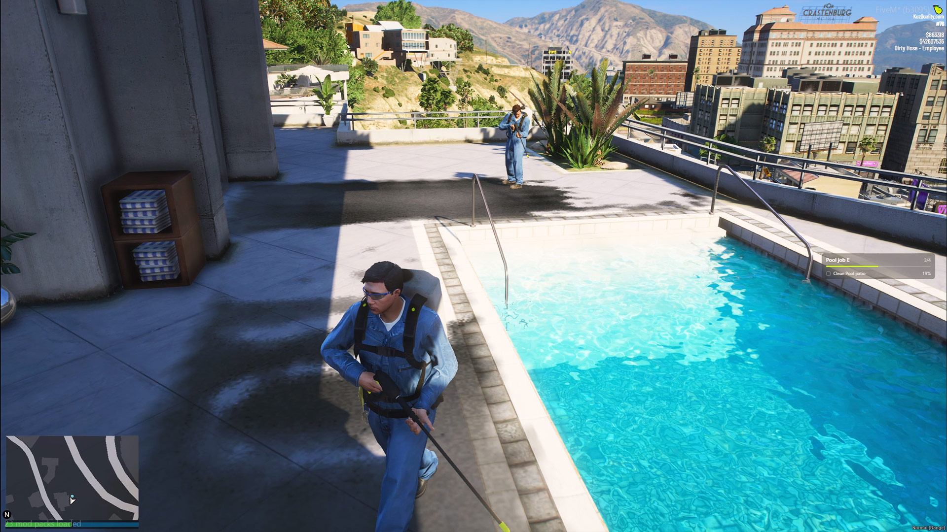 The experience begins and ends at a custom-built headquarters MLO designed specifically for the Powerwashing Job. Players change into work gear, access the contract job board, manage crews, and report back to supervisors here after finishing contracts. The headquarters acts as the central hub for operations, providing an immersive space where crews gather, prepare vehicles, accept new work, and collect their payouts before heading back out to clean the city.