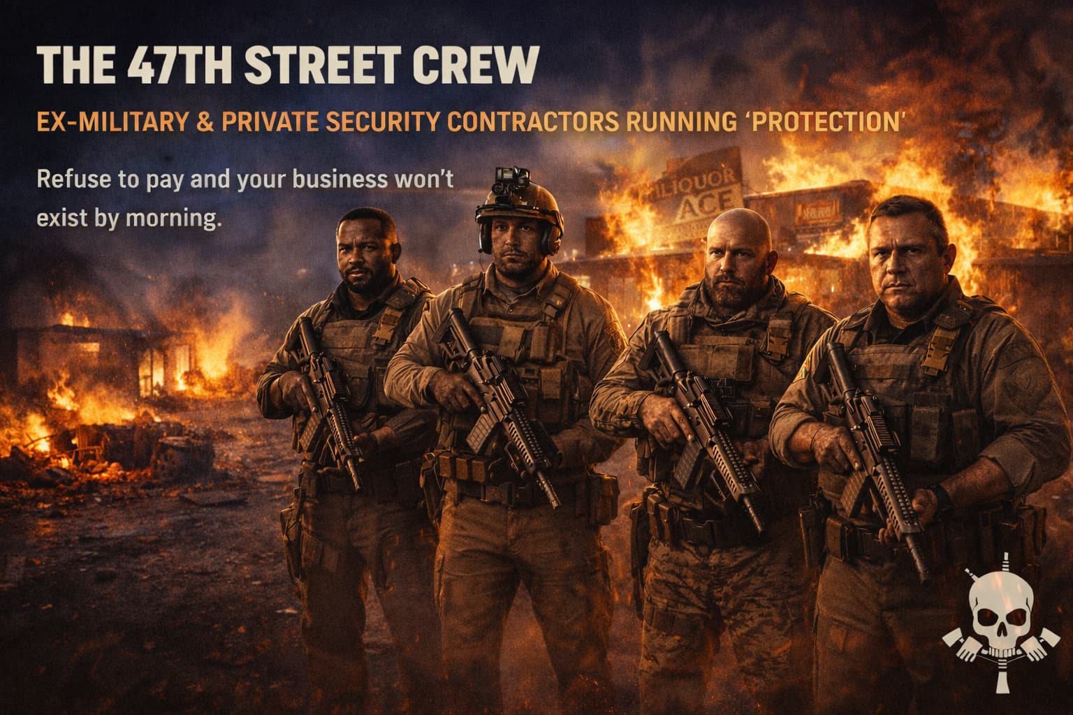 - The 47th Street Crew are ex-military and private security contractors running “protection.” Refuse to pay, and your business won’t exist by morning.
