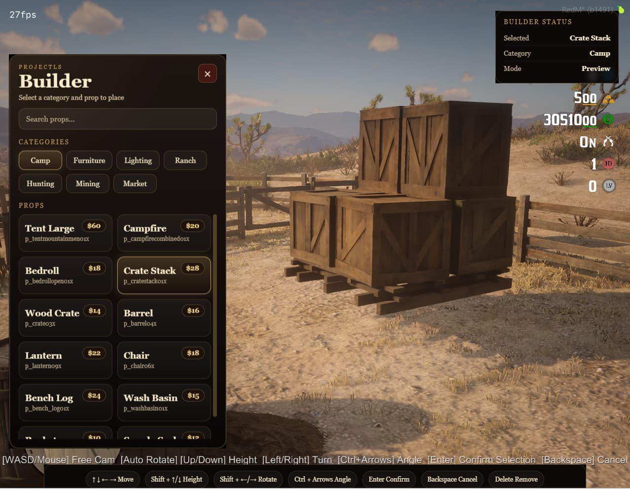 Create, edit, and manage world props directly in-game with a powerful and easy-to-use building system designed specifically for RedM roleplay servers.