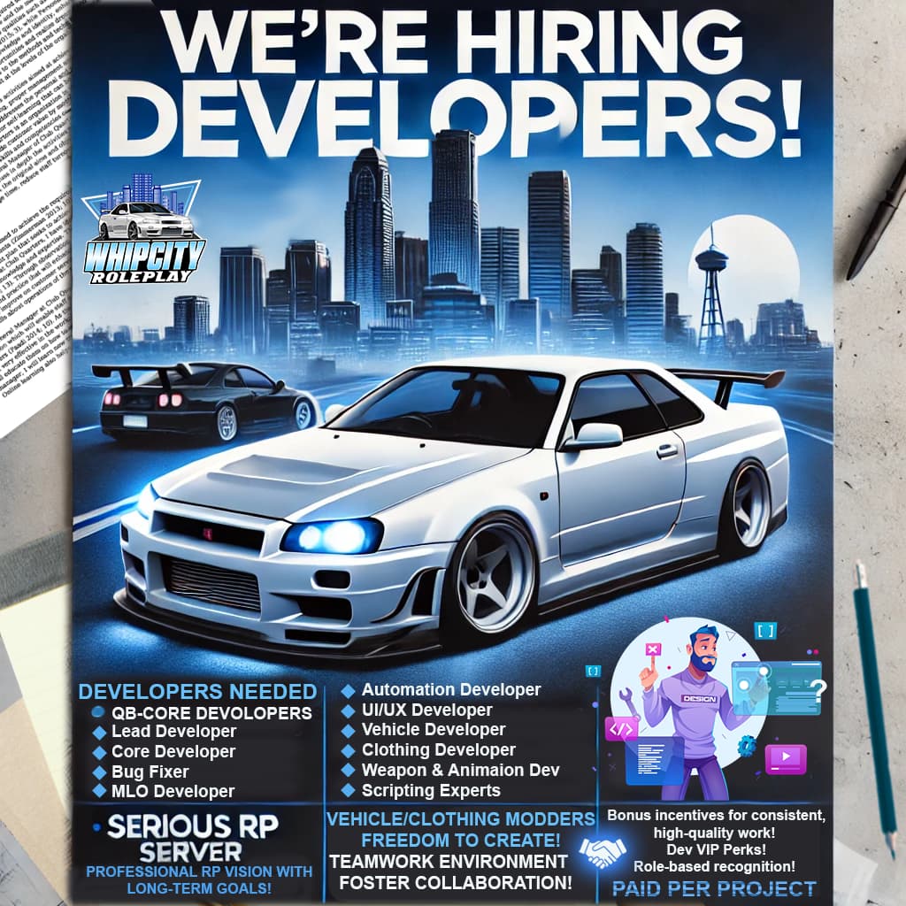 WhipCity RP is on the hunt for skilled and passionate developers who are ready to help create a premium, long-term RP environment. We operate on a dedicated Linux-based server, built for serious roleplay performance and scalability.