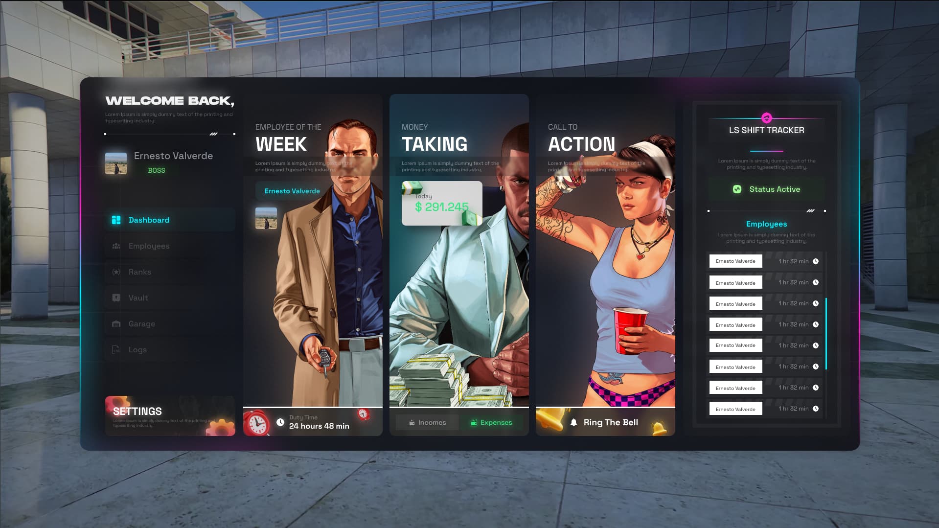 Track working hours, manage ranks, monitor finances, interact with employees, and view detailed logs — all from one intuitive UI.
