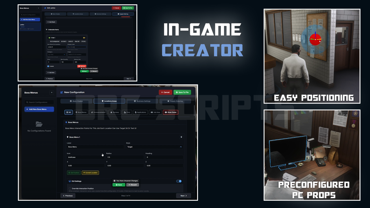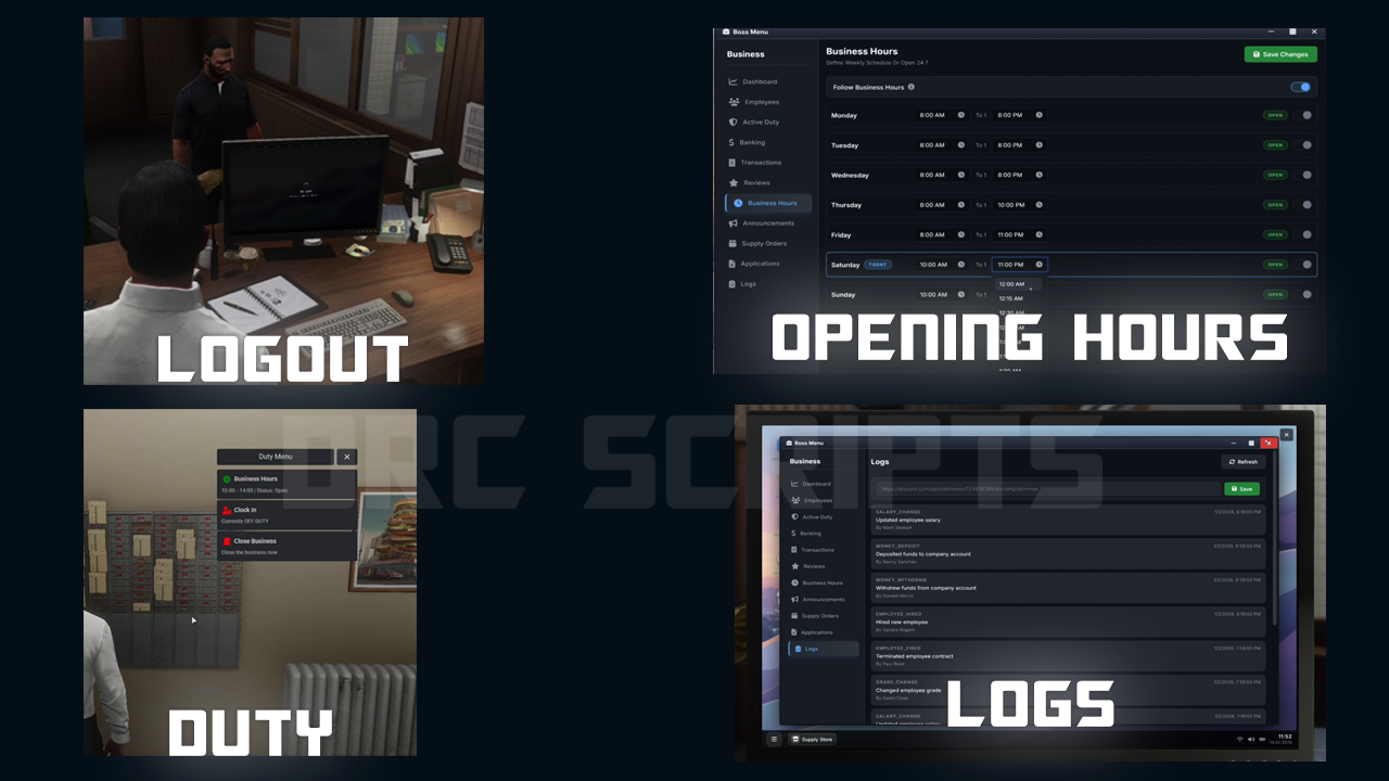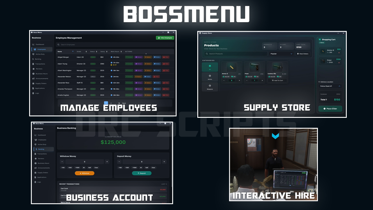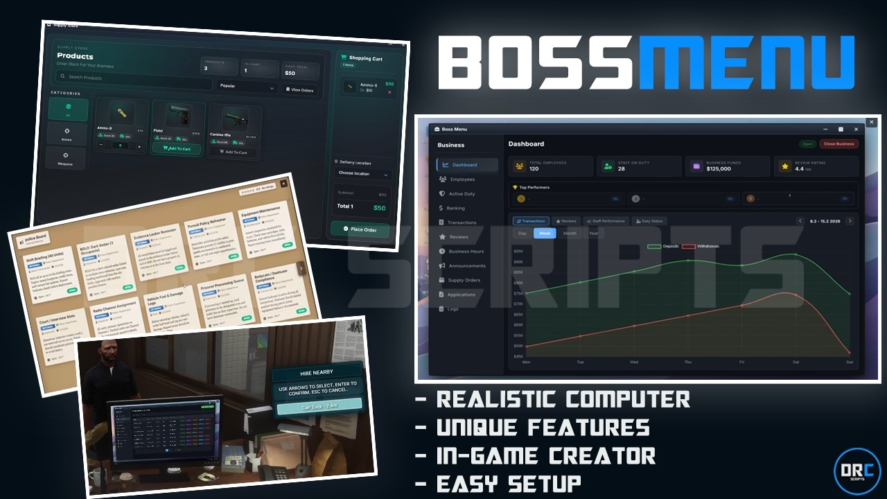 DRC Boss Menu is an advanced all-in-one business management script that gives your server owners and bosses full control over their companies right from an interactive 3D monitor on their desk. Manage employees, track finances, set business hours, post announcements and much more.