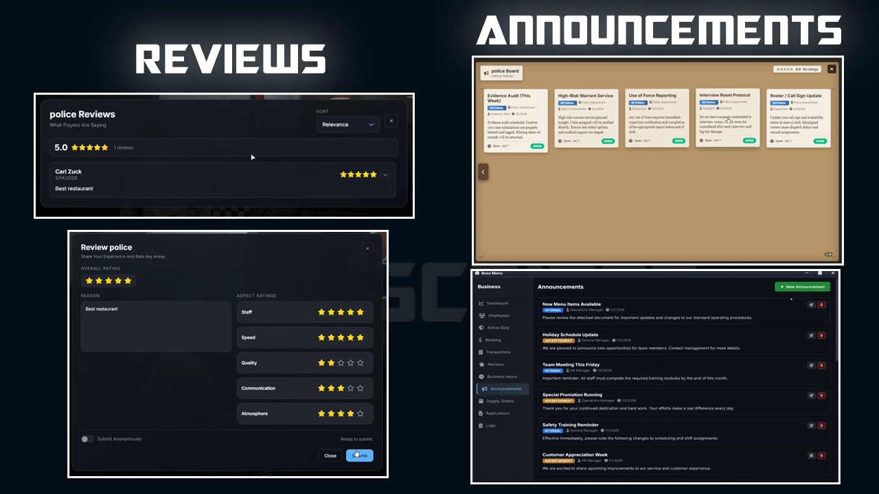 - Announcement Boards - Post internal (job-only) or public announcements visible on in-world boards