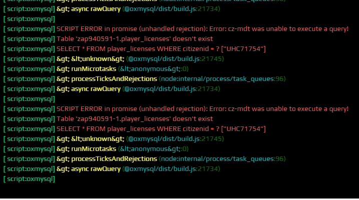 [ script:oxmysql] SELECT * FROM player_licenses WHERE citizenid = ? [“LRB62199”]
