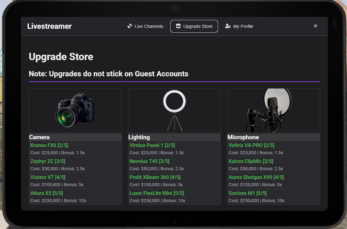 Use the tablet to set up your profile, buy stream upgrades, view active streamers, and send donations.