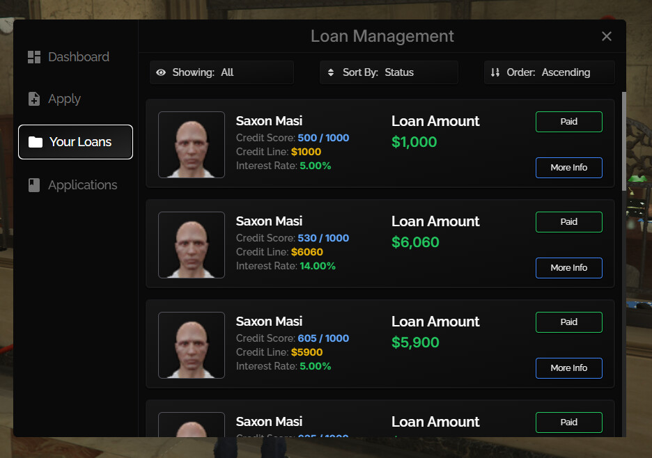 - Credit Score System: The credit score by default is 500, set on the configuration. It increases with each successfully repayment and decreases with non payment. As of right now, it offers no benefit other than the score but it can be integrated with other scripts to make roleplay realism.
