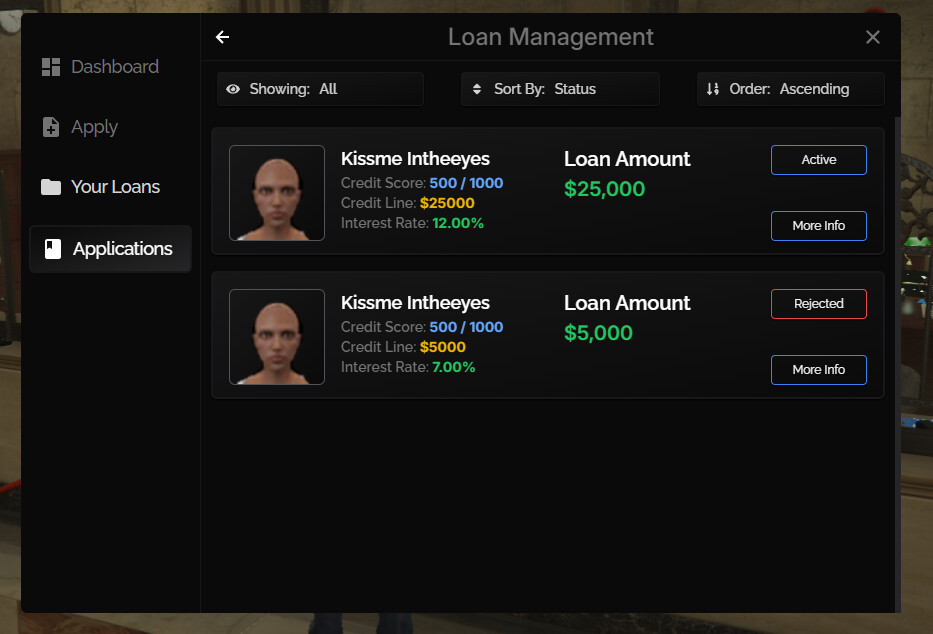 - Banker System: People with the banker jobs are able to view the application, applicant’s history, credit score and credit line of the player at the time of application and decide to approve or reject the loan application.