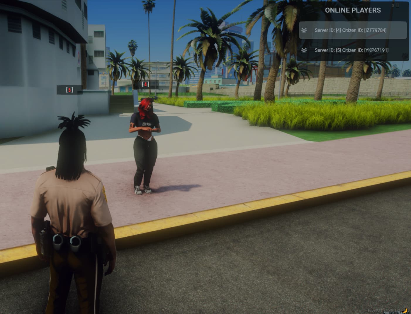 When you press a keybind (set to ‘U’ by default (configurable)) it shows a menu with a list of online player id’s along with their unique identifiers, it also shows a Draw3DText UI above every nearby player’s head (including yourself) with their player ID in it.
