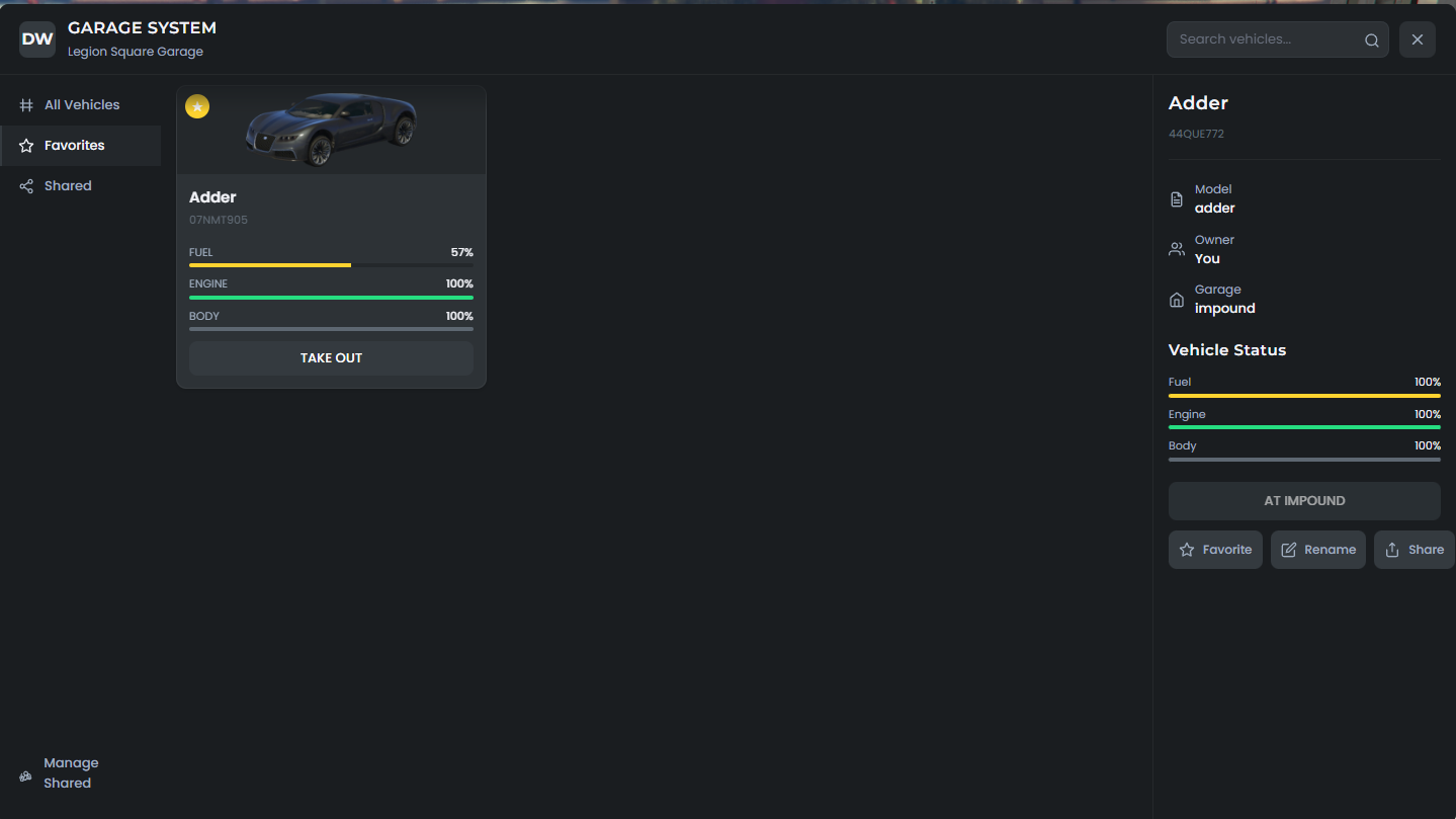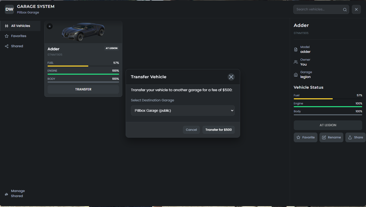 DW Garages revolutionizes vehicle management with an elegant, feature-rich system that goes beyond basic storage. This resource provides players with an immersive, user-friendly interface to manage their vehicles across multiple garage types. From specialized job garages to customizable shared spaces, the system offers unprecedented flexibility while maintaining server performance and enhancing roleplay through realistic vehicle management.