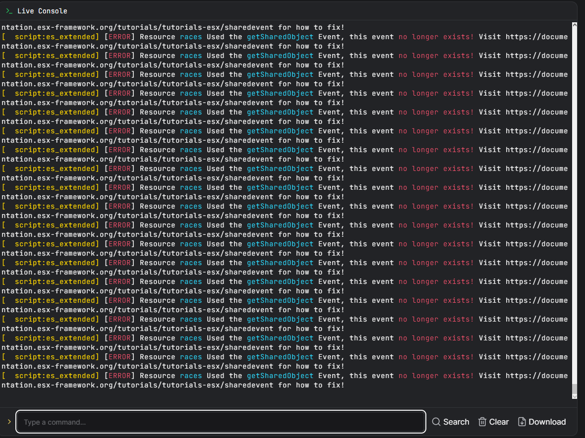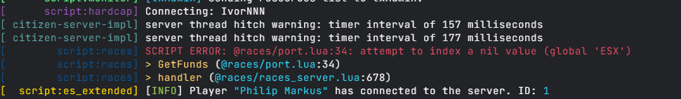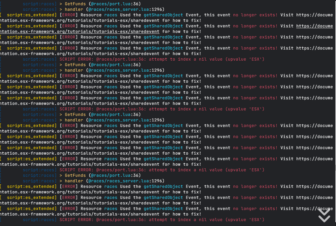 Does the chat command /races funds give the same error? Iâm not sure why youâre getting that error. Actually, it shouldnât matter where the ESX initilization is as long as it is outside of all the other functions.