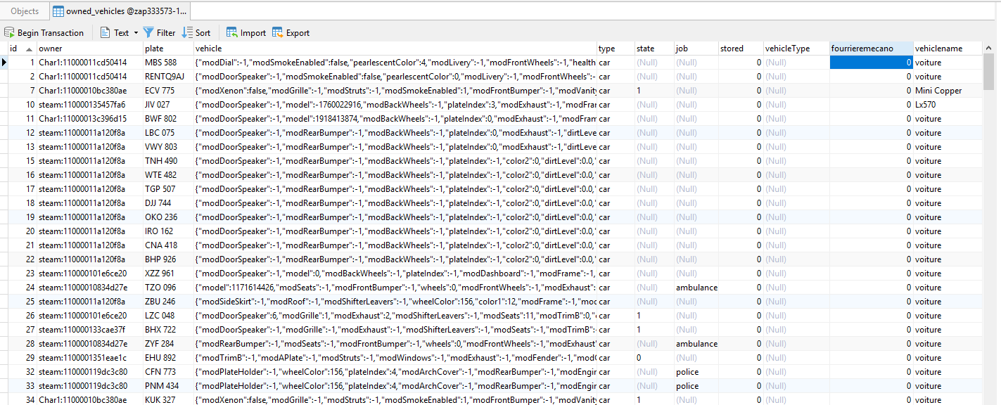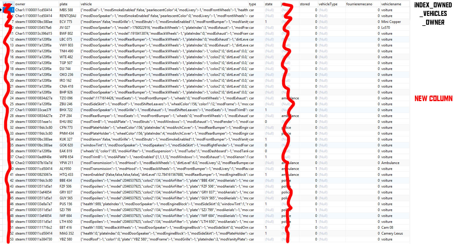 I see. That second screenshot is taken out of âOwned_Vehiclesâ where they buy from esx_vehicleshop. So the society job vehicle shouldnât be there in the first place. Is there a particular script I need to delete/edit to stop society bought vehicles to go into âOWNED_VEHICLESâ database. Will I also need another database for IMPOUNDED vehicles?