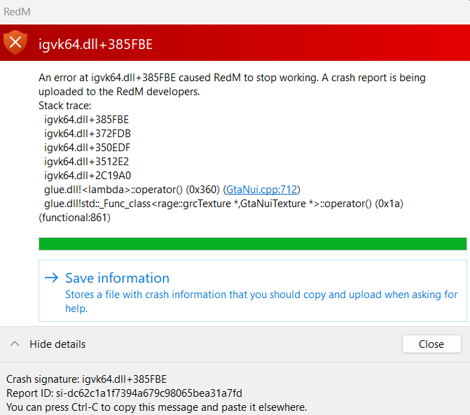 RDR2 version? Up to date? yes Legit or Pirate copy? legit Steam/Epic Games/Social Club? steam Windows version? Windows 11, version 23H2 Did you try to delete caches.xml and try again? no Error screenshot (if any)