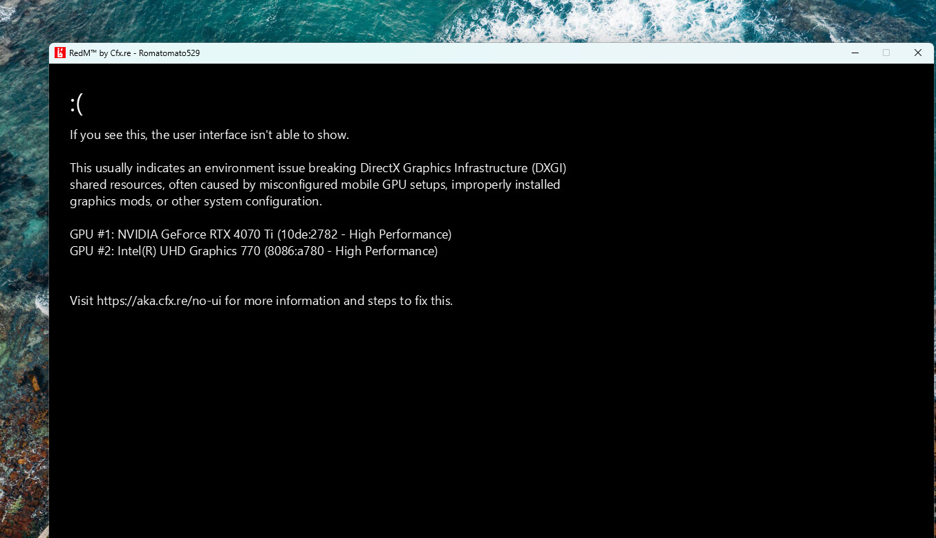 I have tried uninstalling and reinstalling multiple times (Both RedM and RDR2). I have tried forcing both RedM and RDR2 to use my NVIDIA graphics card vs my Intel(R) UHD Graphics 770.