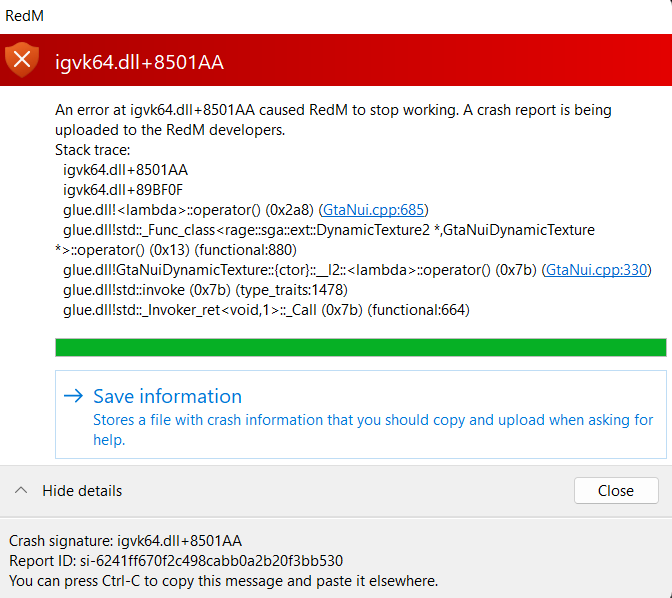 System specifications What did you do to get this issue? na What server did you get this issue on? na Latest CitizenFX_log file .dmp files/report IDs