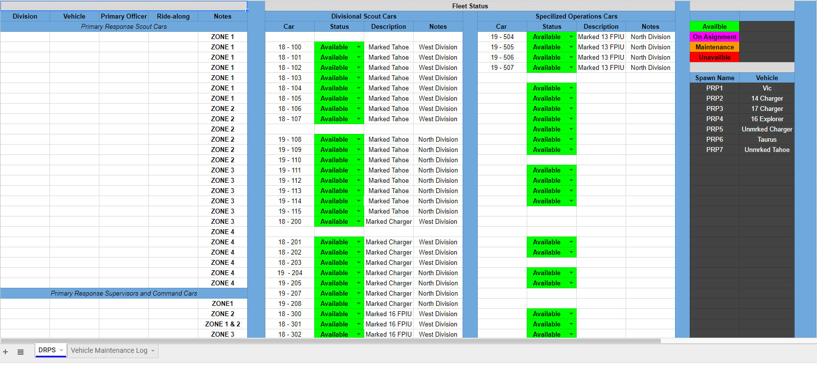 The Durham Regional Police Service is divided into 2 Frontline policing divisions, each division is separated into 2 patrol zones. Prior to a patrol, officers are assigned a scout car and zone based on their current deployment. Our Community is comprised of a live fleet meaning that we have a set amount of scout cars and when one is damaged during patrol it is removed from service for an x amount of days and is logged in our Fleet status sheet.