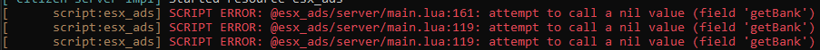 [ script:esx_ads] SCRIPT ERROR: @esx_ads/server/main.lua:119: attempt to call a nil value (field āgetBankā)