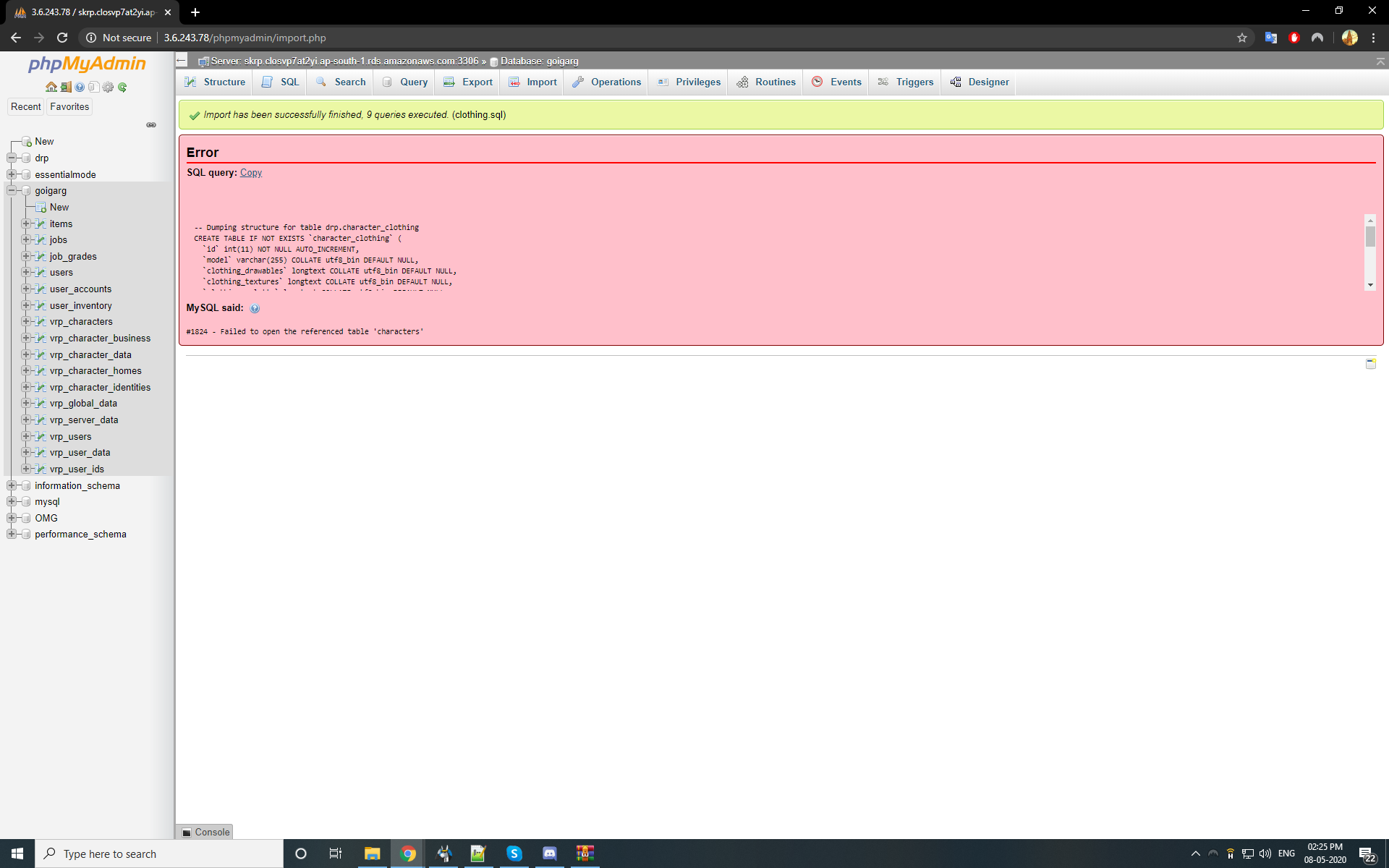 getting error when importing sql to databse