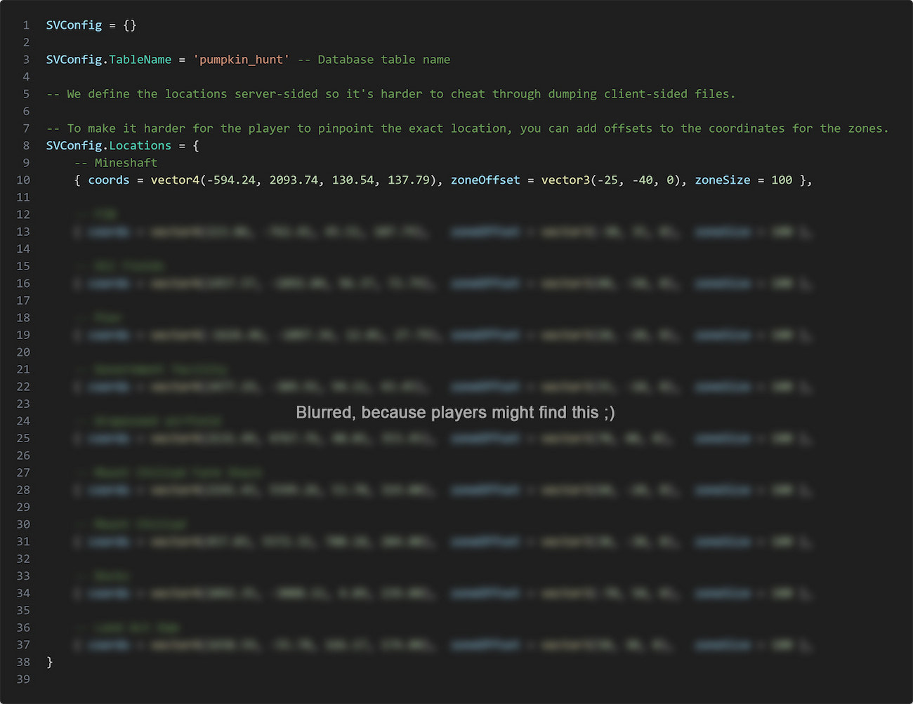 - Server-Side Locations: All pumpkin locations are handled server-side, preventing players from exploiting or cheating by dumping client files.