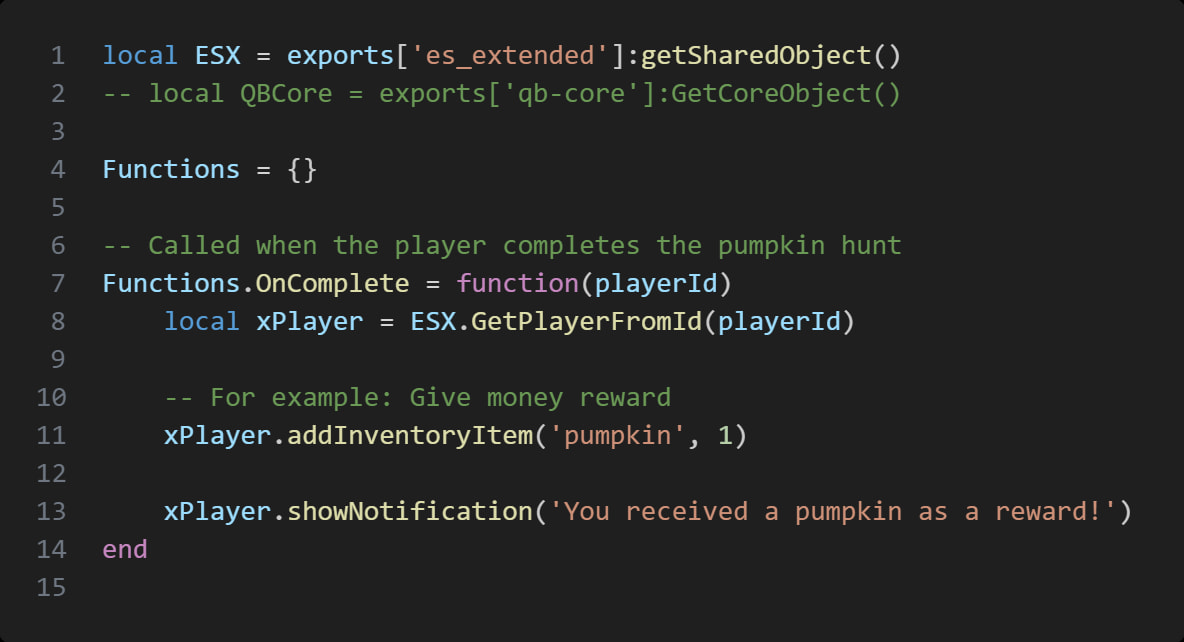 The resource is pretty much drag and drop. The database will automatically be created if it doesn’t exist yet. You only need to manually configure the reward for when a player found all pumpkins.