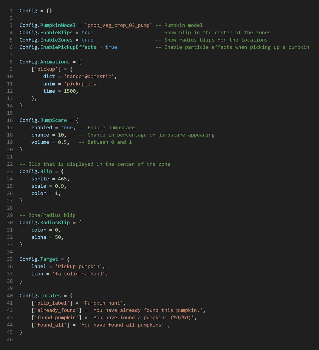 - Blips & Zones: Create zones where players can search for pumpkins. Configurable blips make it easy to mark areas, or make it more challenging by hiding the exact locations.