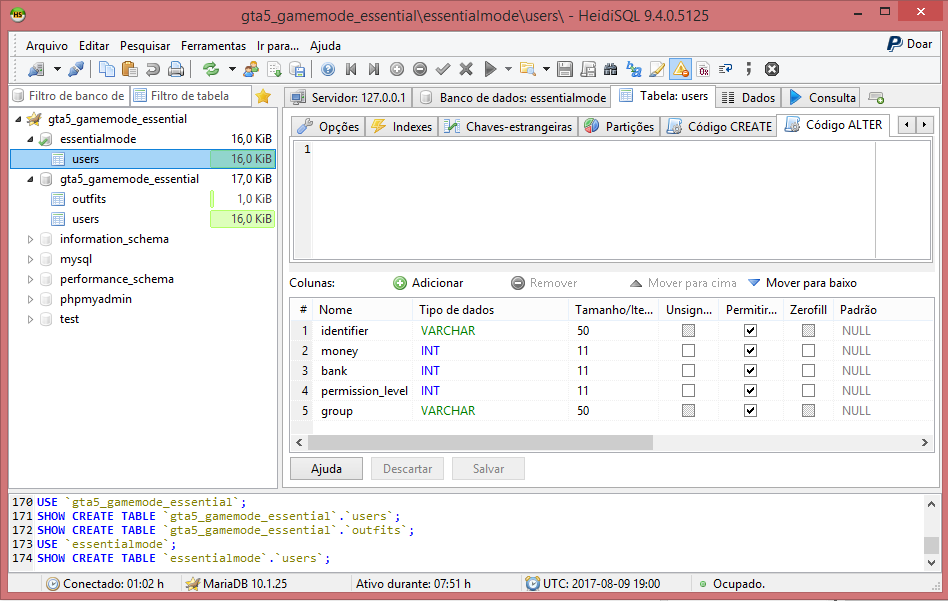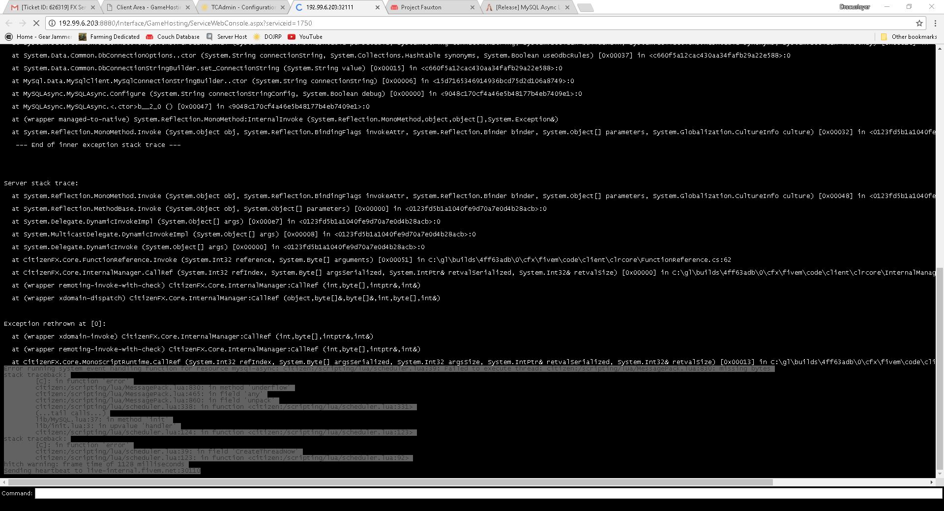 End) I also added set mysql_connection_string âserver = 127.0.0.01; database = gta5_gamemode_essential; userid = root; password =â on server.cfg Iâll leave the prints here also showing everything. Does anyone know what this error can be?
