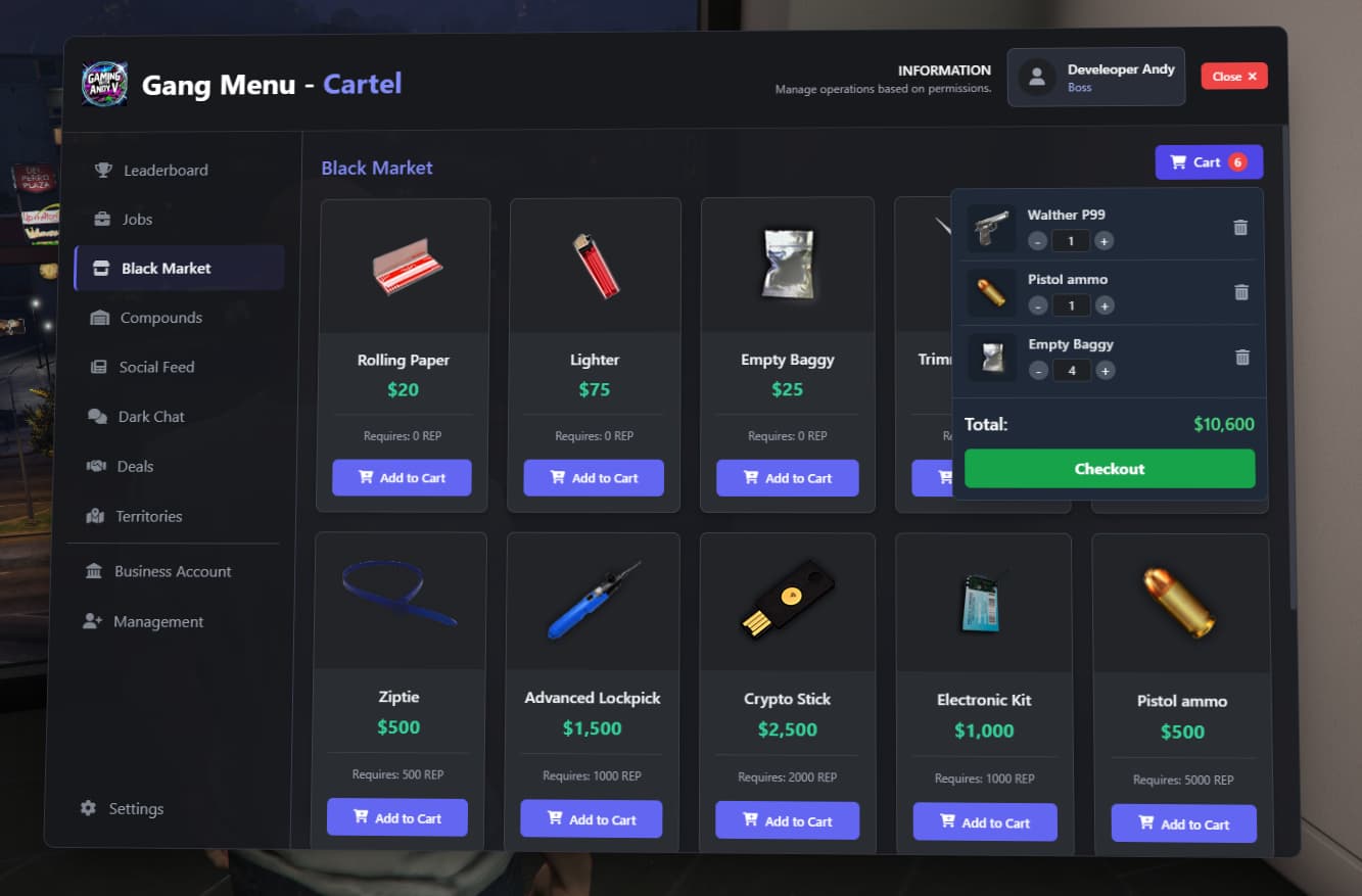 Shared Black Market: A single, easy-to-manage black market accessible to all gangs, with items gated by each gang’s individual reputation level.