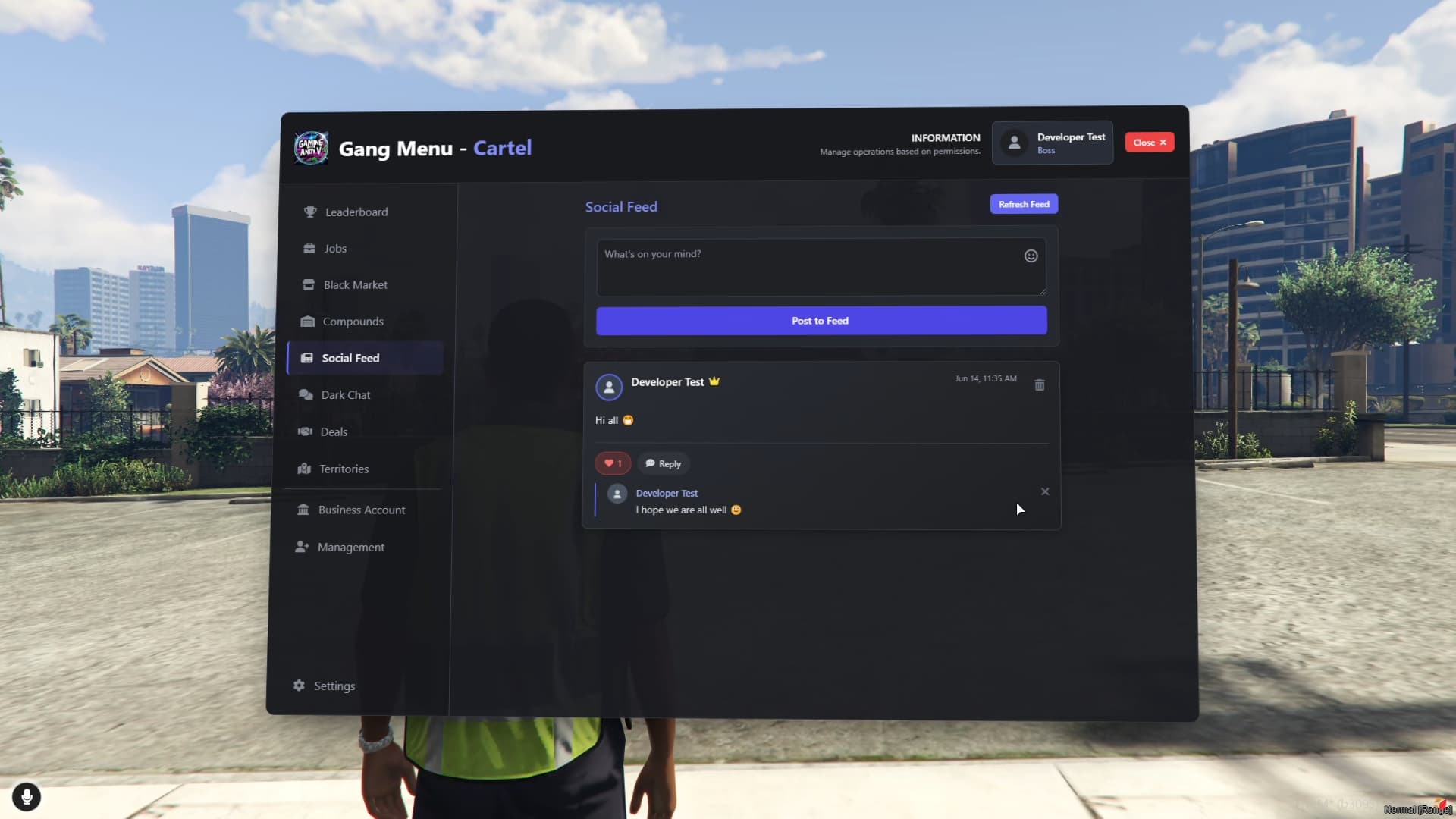 Interactive Social Feed: An in-game social hub where members can post updates, like posts, and reply to each other, fostering a strong sense of community.