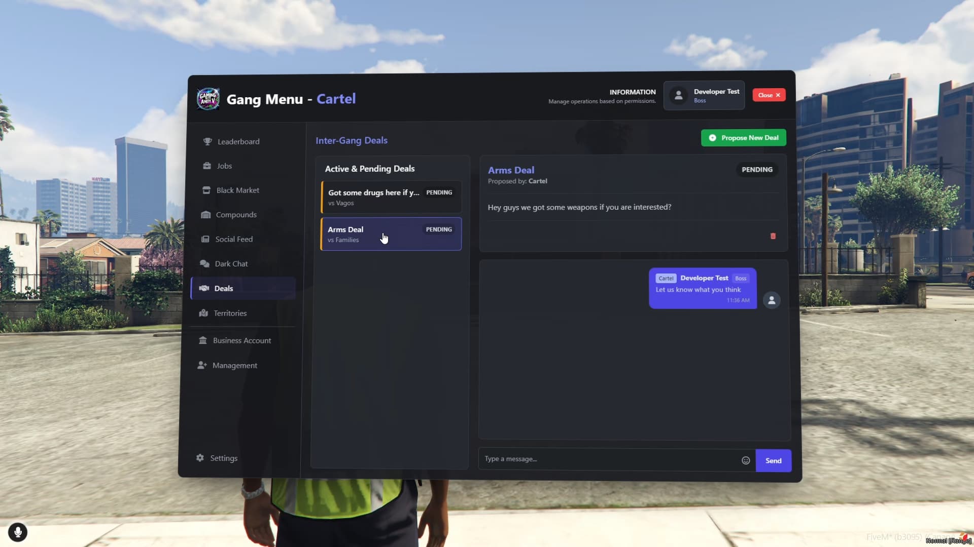 Inter-Gang Deals: A formal contract system allowing gang leaders to propose, negotiate, and track deals with other gangs, complete with dedicated private chat channels for each contract.