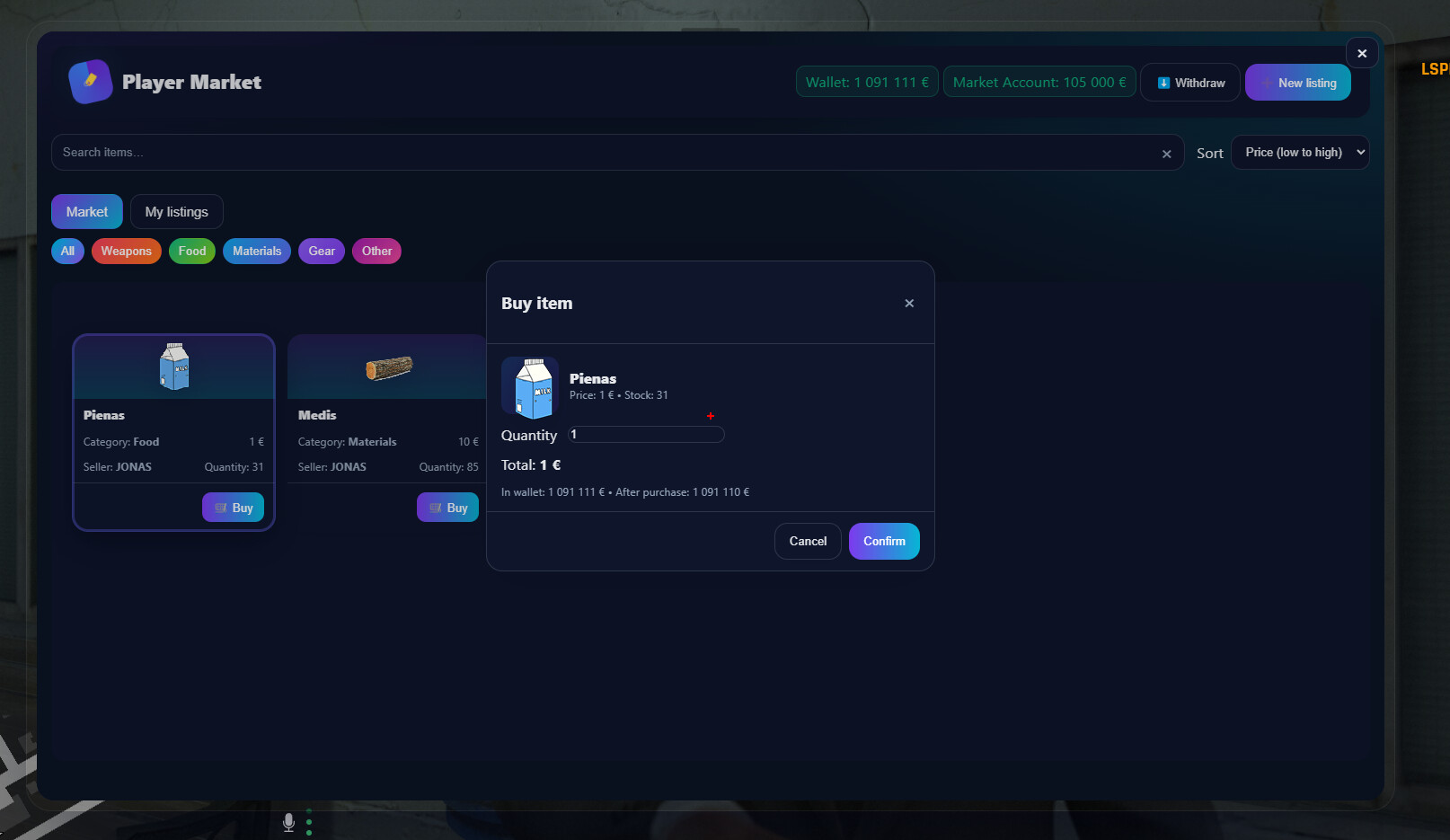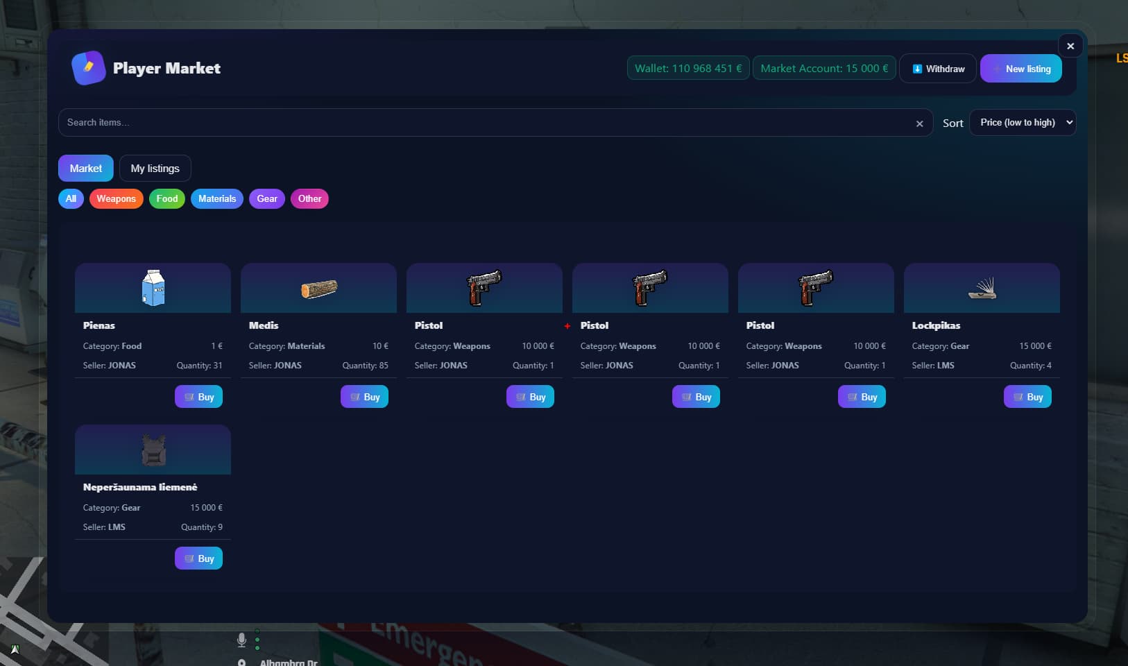 Config.LimitsandConfig.IsItemAllowed. - Manage funds: sales/purchases go to the market wallet; withdraw via the Withdraw action. Funds are debited/credited via your framework or as an item fallback.