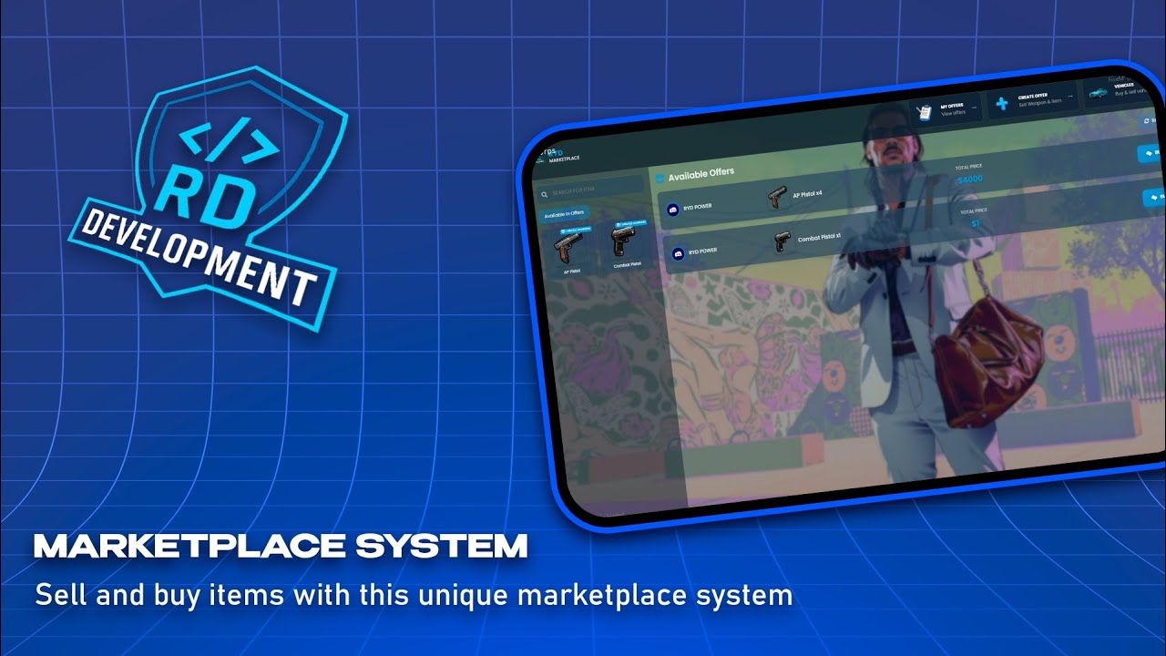 The RD MARKETPLACE script is an advanced and comprehensive marketplace system for FiveM, allowing players to buy and sell items and vehicles in-game. It features a modern, user-friendly interface with full support for QBCore and ESX frameworks.