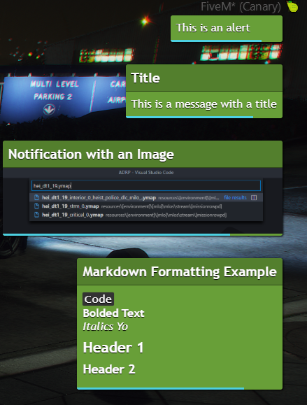 The example is just that, an example implementation. This isn’t an alert script off the get-go. I will be adding functionality to it that allows for users to create their own alert system if they would like, but at its base, this resource is a general use notification system with high customizability. What you use that customizability for is up to the user.