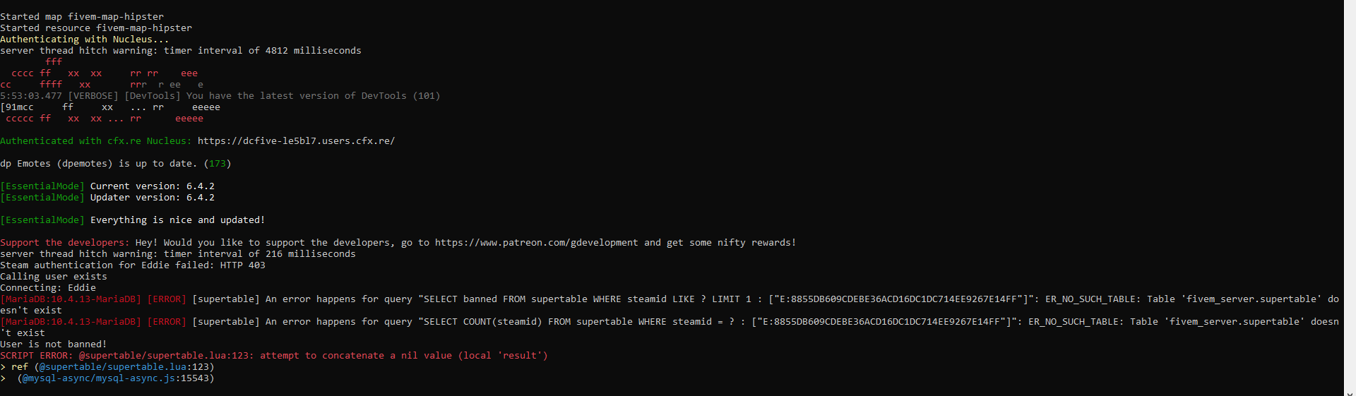 when i connect to my server.The console print : [MariaDB:10.9.1-MariaDB] [ERROR] [supertable] An error happens for query “SELECT money FROM supertable WHERE steamid LIKE ? LIMIT 1 : [“E:4C63C3B71E7CF37005D999D644FB2B8F85581D9F”]”: ER_NO_SUCH_TABLE: Table ‘server.supertable’ doesn’t exist